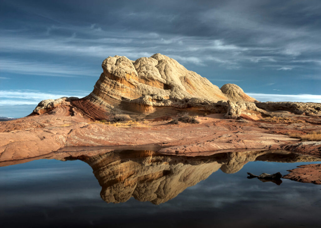 Our 4X4 vehicles get us to this remote location and that effort is part of what makes the location so special. As we roll though junipers and the sandstone rises in layered waves of ivory, ochre, and crimson, and then suddenly we come upon the formations that feel almost surreal — sweeping ridges, twisting patterns, and quiet reflecting pools scattered across the ochre, orange and white formations.